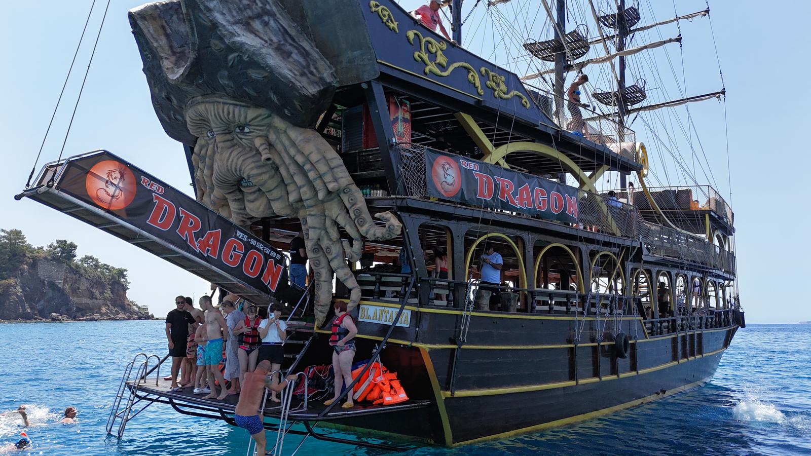 Тур на пиратском корабле «Red Dragon» приглашает вас в захватывающее морское путешествие, где вы сможете насладиться купанием в великолепных бухтах и получить заряд приключений.